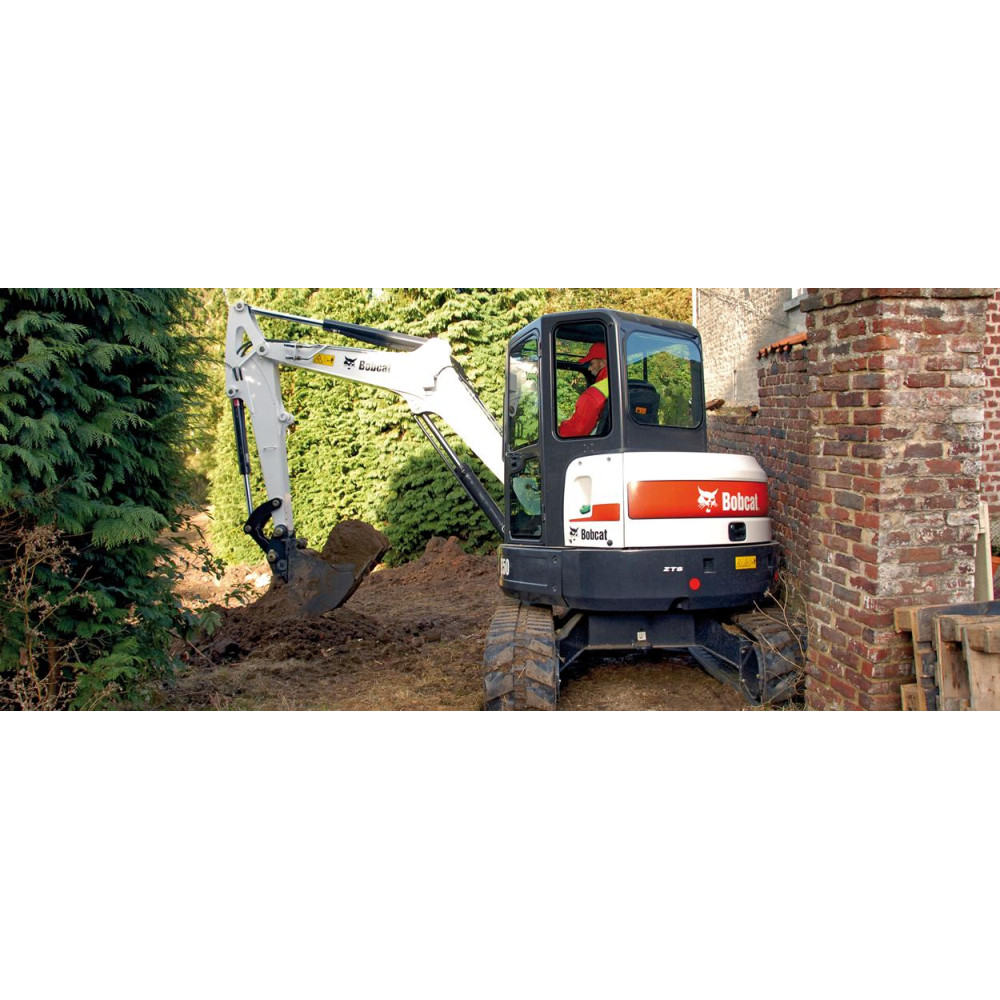 Екскаватор Bobcat E50 примітний своїми малими розмірами, завдяки яким його можна використовувати як на невеликих вуличних майданчиках, так і в обмежених приміщеннях. його допомогою: